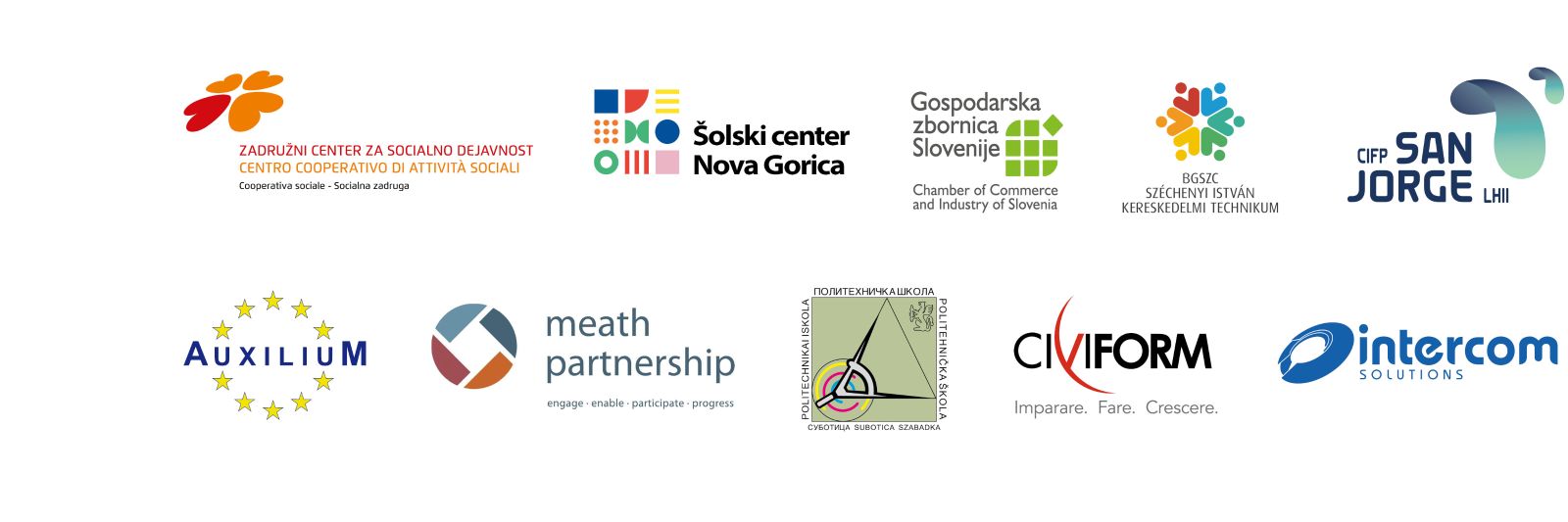 Project partners: ŠOLSKI CENTER NOVA GORICA | GOSPODARSKA ZBORNICA SLOVENIJE | BUDAPESTI GAZDASÁGI SZAKKÉPZÉSI CENTRUM SZÉCHENYI ISTVÁN KERESKEDELMI TECHNIKUM | CENTRO INTEGRADO DE FORMACIÓN PROFESIONAL CIFP SAN JORGE | AUXILIUM PRO REGIONIBUS EUROPAE IN REBUS CULTURALIBUS | MEATH COMMUNITY RURAL AND SOCIAL DEVELOPMENT PARTNERSHIP LIMITED | POLITEHNIČKA ŠKOLA SUBOTICA | CIVIFORM | INTERCOM SOLUTIONS